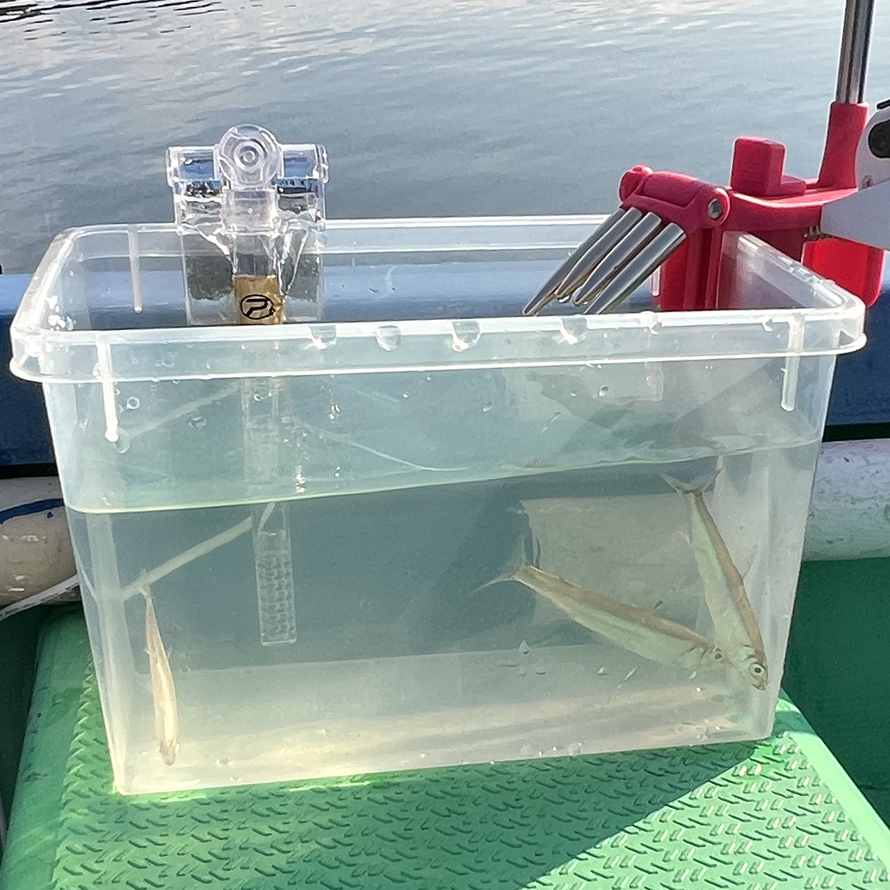3.4Lの水槽はワカサギのドロ吐かせすための活かしバケツに最適。フタ付なのでタックルボックスとしても使用可能。