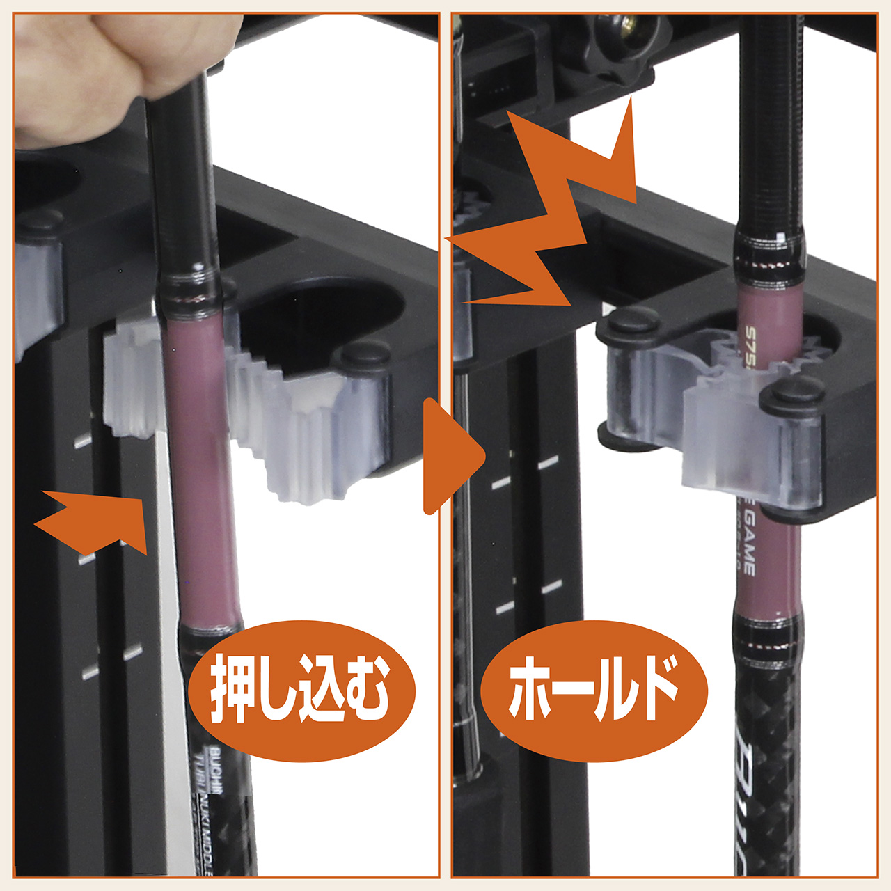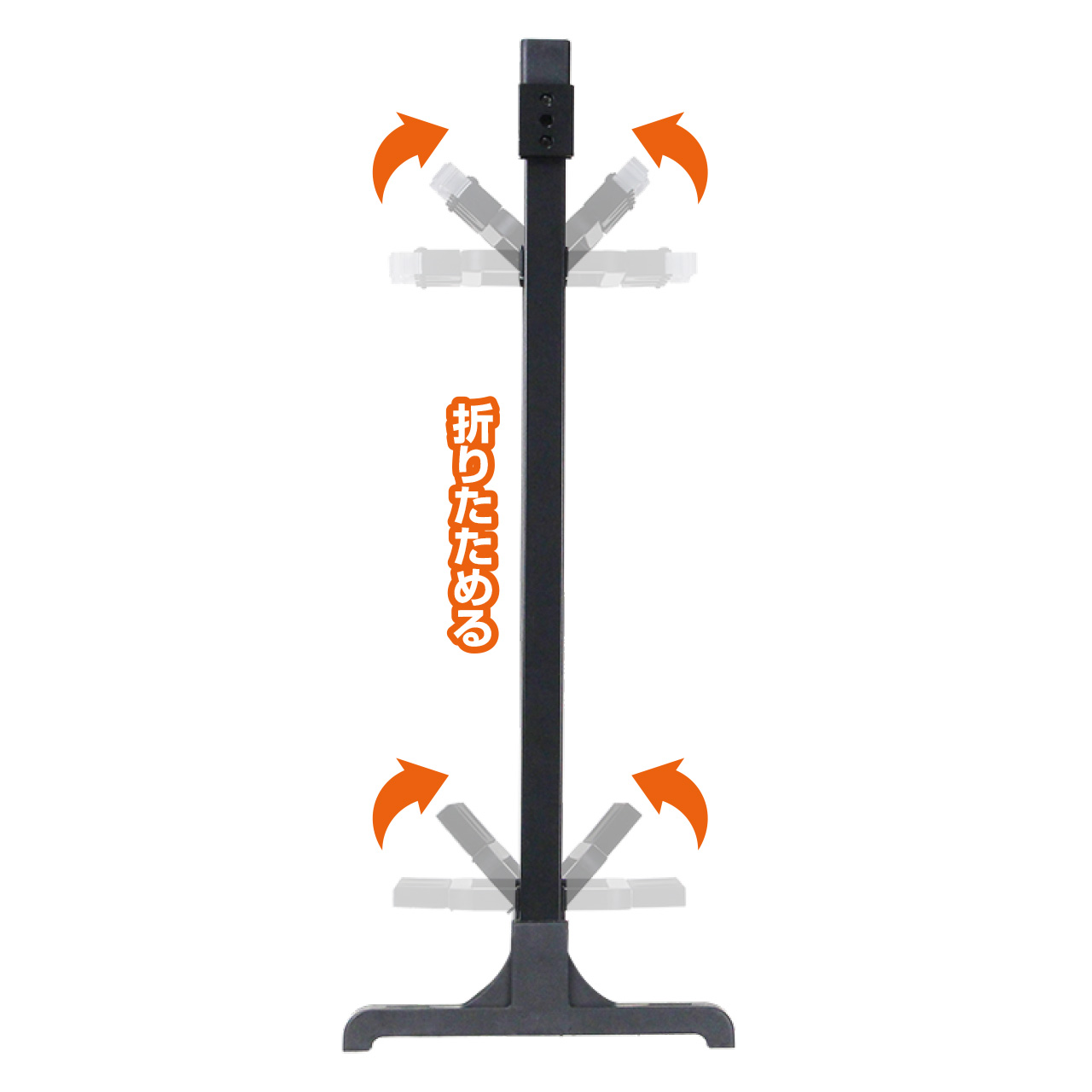 ロッドに合わせてホールド部の高さ調節が可能で、折りたたんでスリムに収納。収納や車載時に便利。