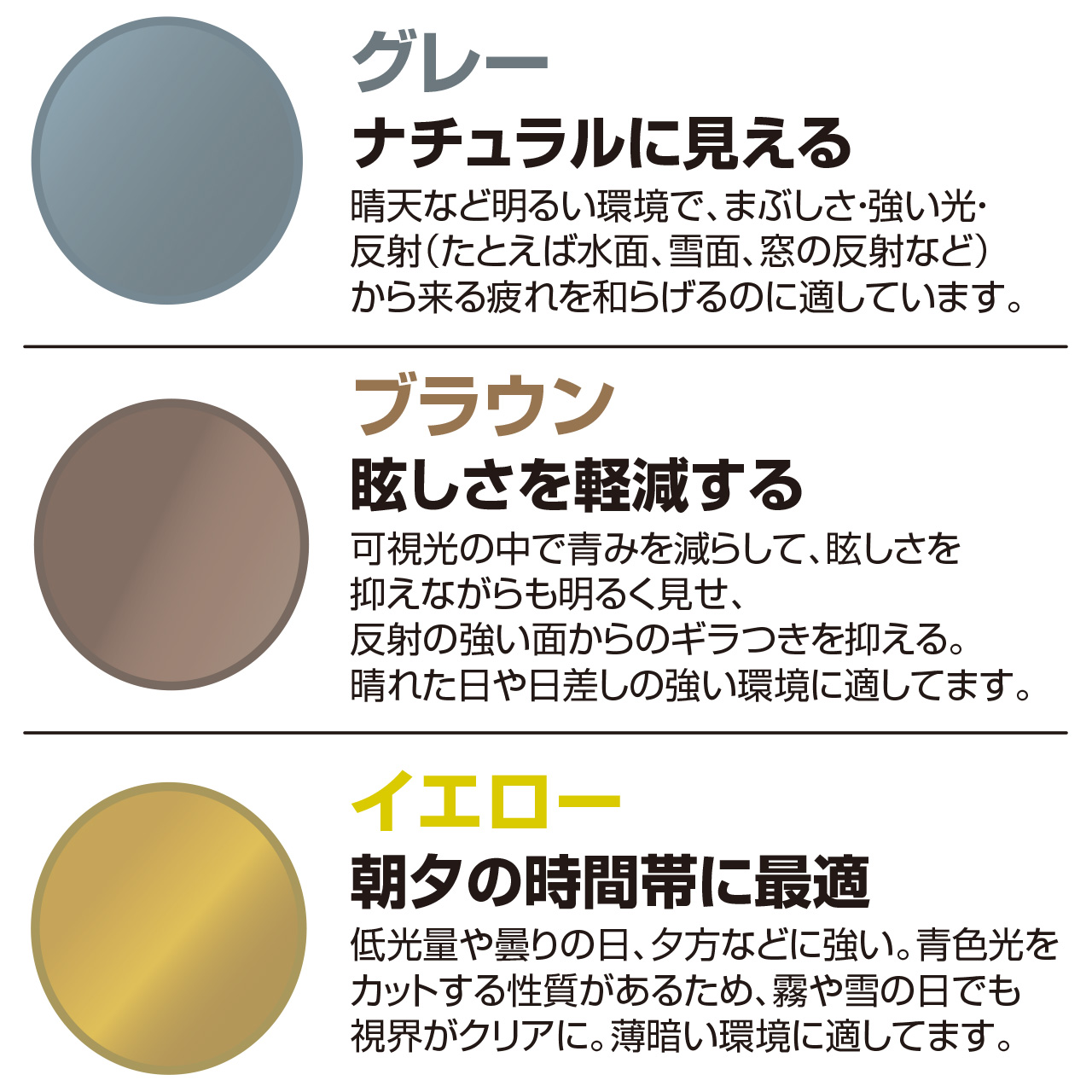 ナチュラルに見えるグレーレンズ、眩しさを軽減するブラウンレンズ、曇天時にも対応するイエローレンズ。シーンに合わせてお選びください。
