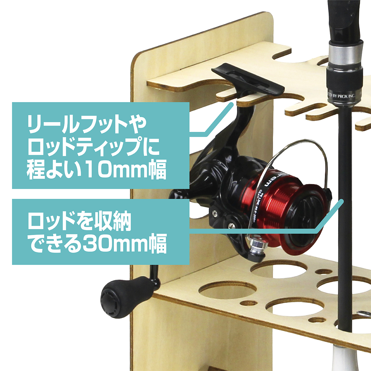 ※ロッドやリール形状によっては、収納できない場合がございます。また、ベイトリールは吊り下げられません。