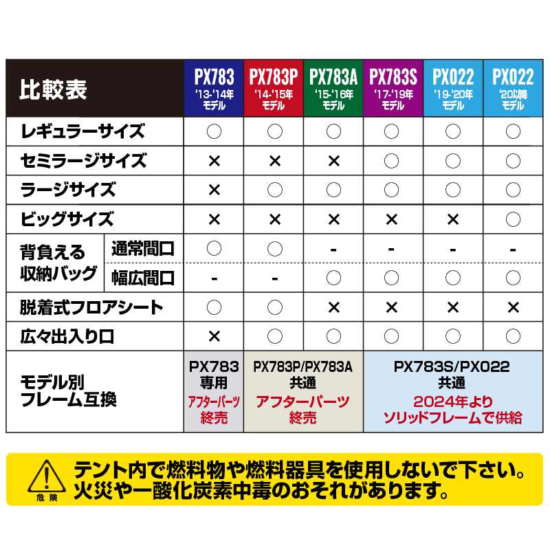 ※火気には近づけないで下さい。またテント内で燃料物や燃料器具を使用しないで下さい。火災や一酸化炭素中毒のおそれがあります。