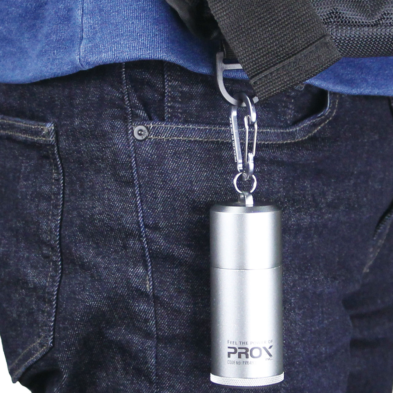 底部が取外し出来るゴミ捨てキャップになっており、中のゴミを一気に捨てられる。付属のカラビナで衣服やカバンに取付け。